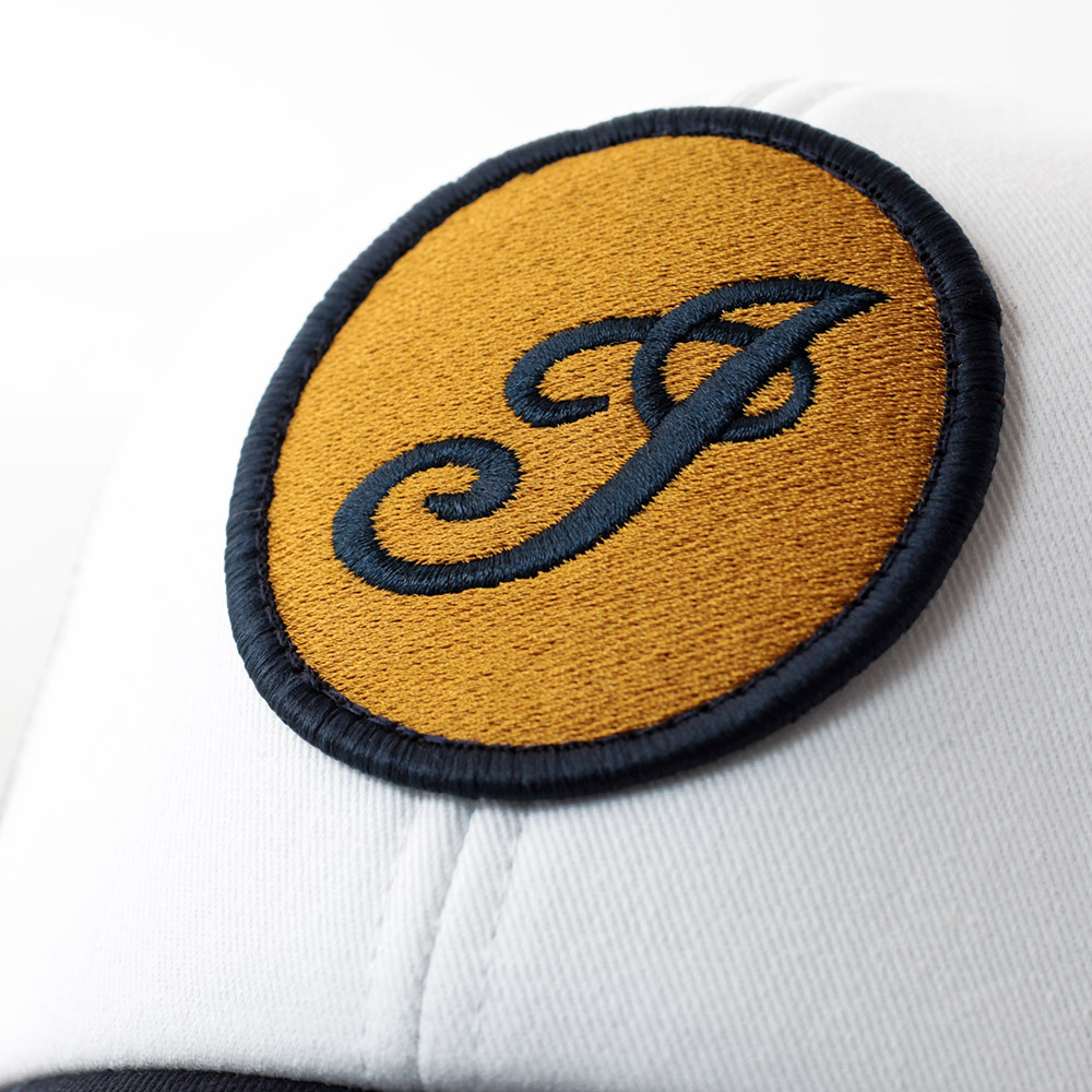 ・フロントに存在感のある丸型のブランドロゴ刺繍ワッペンが施されています。