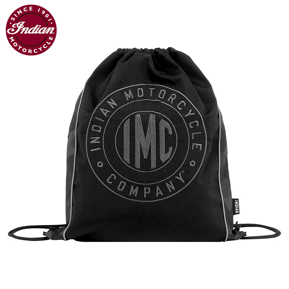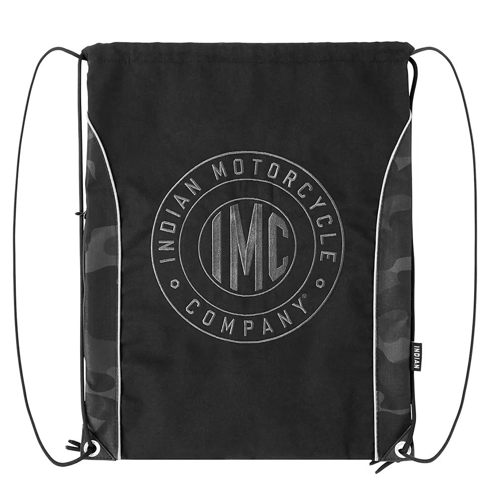 This is an authentic Indian Motorcycle Camo Drawstring Bag in Black. It is a lightweight, foldable, and highly functional bag perfect for riding adventures or daily use.
