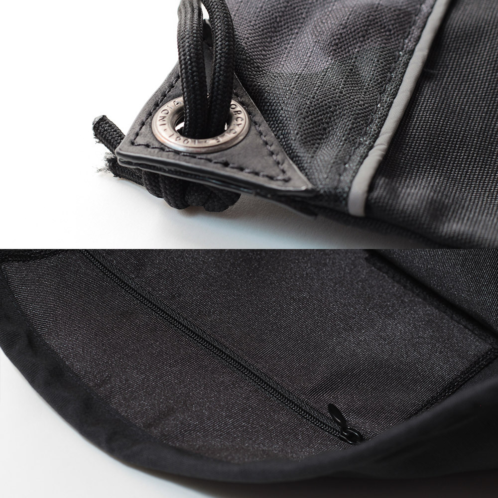 ドローストリングバッグには珍しくサイドジップポケットも装備しています。