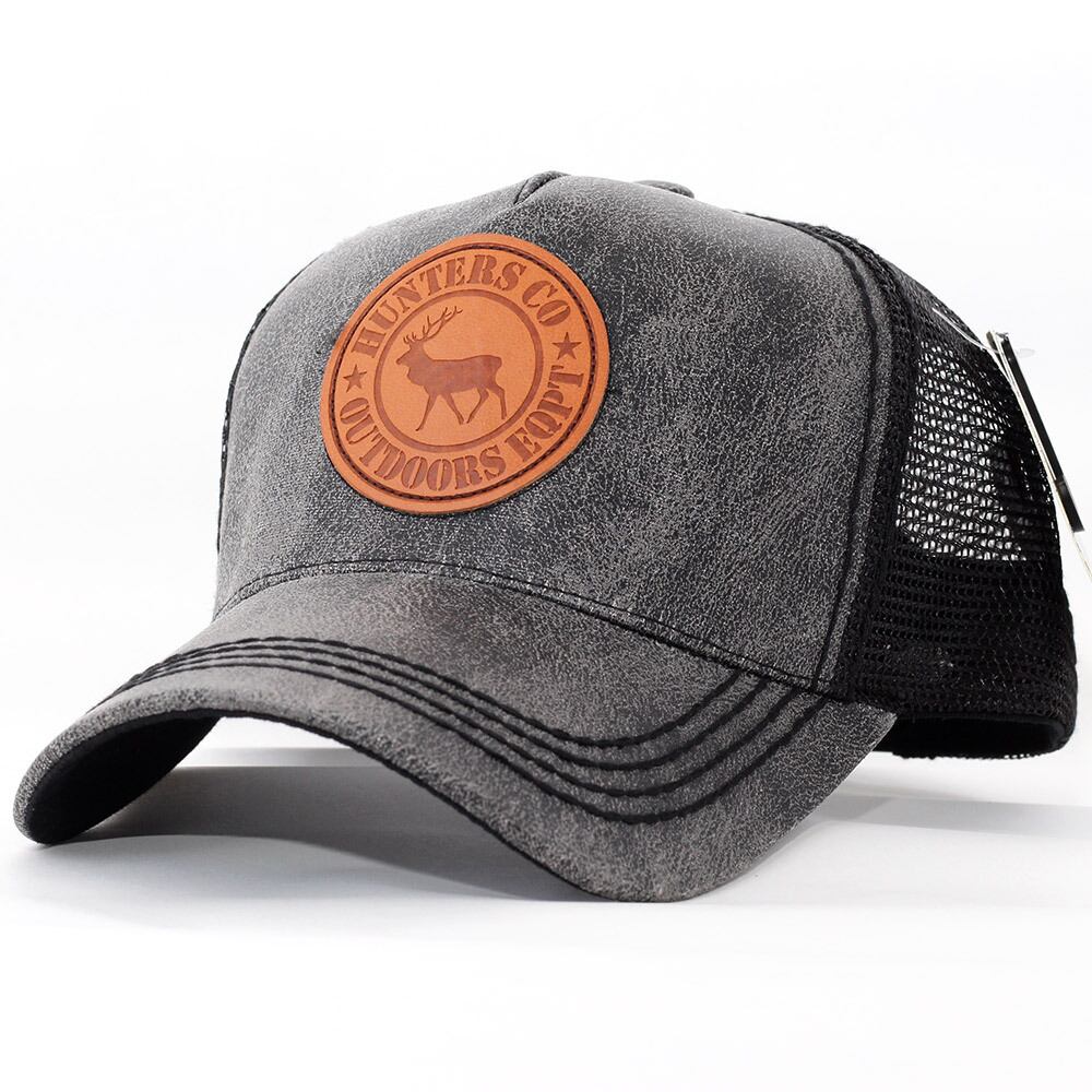 ビンテージ調のブラックカラーにハンティングアップリケがポイントのメッシュキャップ帽。