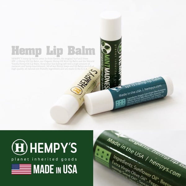 HEMPY’S hemp lip balms come in three flavors, the original Surf and Snow SPF 15 Hemp Oil Lip Balm, our Organic Hemp Oil Mint lip Balm and the Natural Vanilla Hemp Oil Lip Balm. Keep your lips feeling soft with a high amount of moisture and hemp nourishment. All of our Hemp Soaps and lip Balms are full of high quality, all natural eco-friendly ingredients and are made in the U.S.A.
